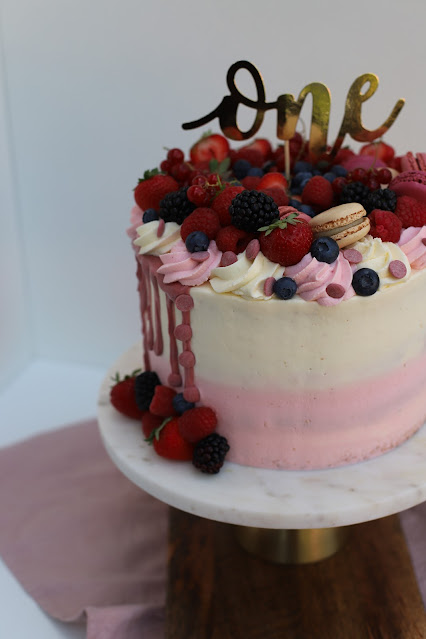Mit der Creme im Spritzbeutel, sowie Beeren, Macarons, Ruby Schokodrops etc. die Torte dekorieren.