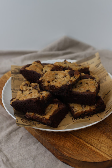 Weizenmehl, Backpulver und die Prise Salz Kurz untermischen, bis alle Zutaten gerade so vermengt sind. Zu guter Letzt Schokotröpfchen untermischen und dann den Teig in kleinen Portionen gleichmäßig über die Brownie-Masse verteilen.